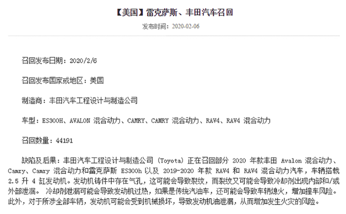 当时,丰田在美国召回了44191辆汽车,包括2019-2020年款的亚洲龙、凯美瑞、RAV4和雷克萨斯ES,均为搭载2.5L发动机的混合动力及燃油版车型。召回原因是“发动机铸件中存在气孔,这可能会导致裂纹,进而导致冷却剂出现内部和/或外部泄漏。”