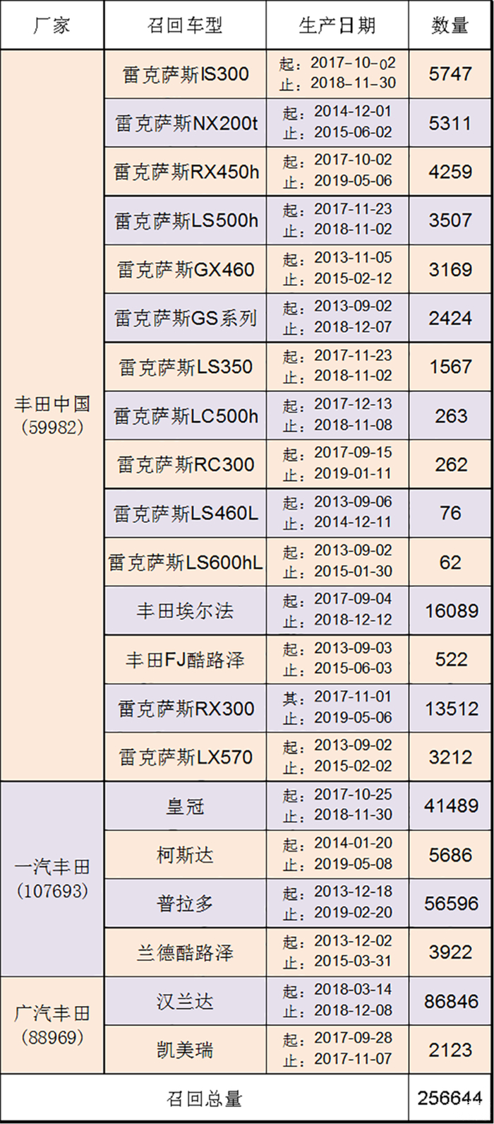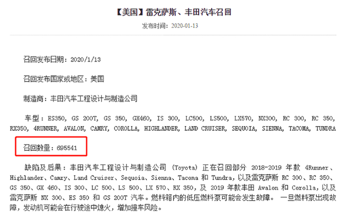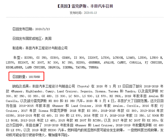 ▲丰田召回车型名录,来源:国家市场监督管理总局缺陷产品管理中心