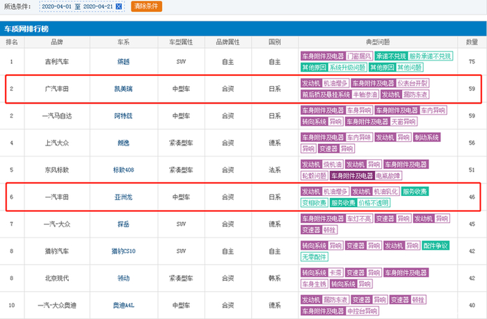 ▲4月1日-21日,凯美瑞和亚洲龙依然位于投诉榜前十。来源:车质网