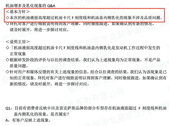 ▲丰田官方对机油增多和机油乳化问题的回复