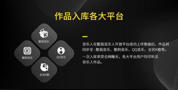 此外,新人在酷我音乐人开放平台成功上传歌曲后,该歌曲将同步至酷狗音乐、酷我音乐、QQ音乐、全民K歌等各大平台,享有作品一次入库全网曝光的福利,优质音乐作品将“流动”到更多乐迷心中。