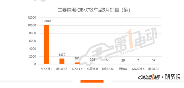 除了Marvel X,其余B级车型在3月都实现了环比正增长,蔚来ES6、广汽新能源Aion LX以及比亚迪唐EV在绝对数上的提升都较大。