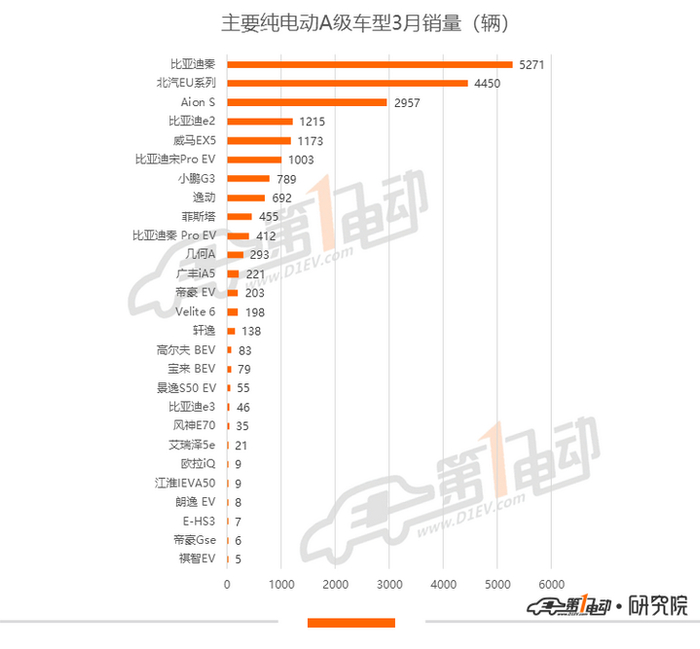 2019年11月上市的新款秦EV,逐渐取代元EV,成为比亚迪在纯电动市场的“流量担当”。从去年11月开始有销量录入以来,单月销量均维持在千辆以上水平,今年3月销量直接上升至5271辆,首次来到A级纯电动车型销量冠军位置。