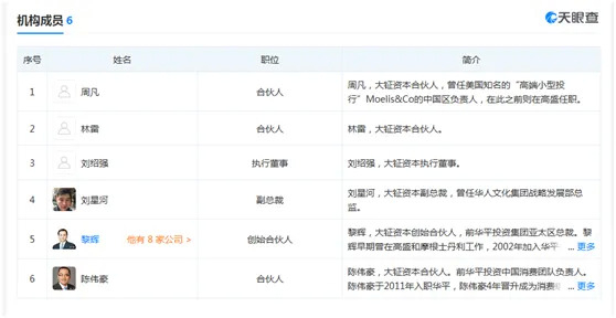 从天眼查可见,大钲资本合伙人和管理团队跨私募股权投资、企业金融、并购重组、企业管理、运营和战略咨询等多领域。