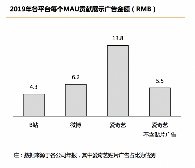 YouTube是全球最大的视频网站,在2019年的年报中,谷歌首次公开了YouTube的收入情况,其2019年广告收入达152亿美元,广告收入占平台总收入约90%。YouTube在全球MAU超过20亿,这意味着YouTube每个MAU贡献的收入约为58元人民币,而B站则是52元人民币。这说明,从整体变现水平来看,两者并无显著差异,真正拉开两者差距的是用户规模。
