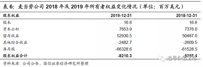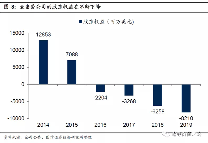 早在2016财年,麦当劳公司的净资产便已经小于0;此后,麦当劳仍在不断地发债回购流通股并转入库存股票,导致企业净资产持续下降。截至2019财年末(2019年12月31日),麦当劳公司总资产由上期末的328亿美元上升至475亿美元,同时总负债也由391亿美元大幅上升至557亿美元,因此,麦当劳公司的股东权益从2018年底的-63亿美元下降至了-82亿美元。