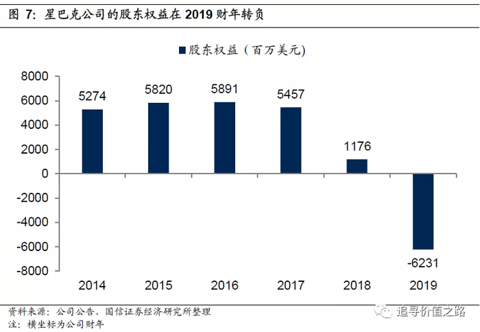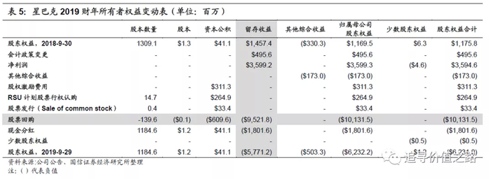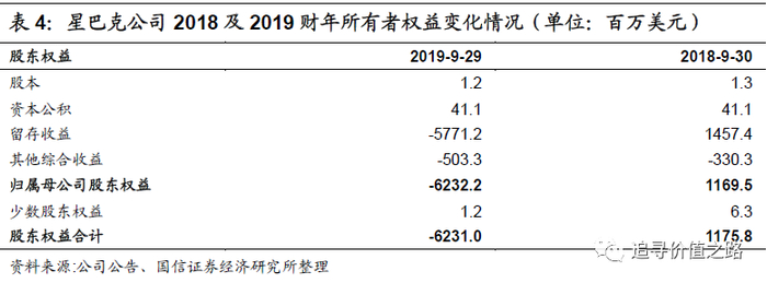 表4是星巴克资产负债表中股东权益部分的情况,从细分科目的列示情况来看,净资产小于0主要的原因是留存收益科目出现了大幅的下降,2018财年星巴克留存收益尚有接近15亿美元的余额,但到了2019财年末,留存收益大幅下降至-57.7亿美元,这直接导致了星巴克的股东权益大幅转负。