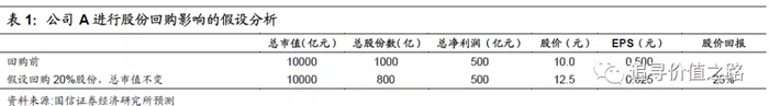 在上述公司A进行股份回购的假设案例中,由于回购行为不会导致公司净利润出现变化,回购前后净利润均为500亿元,因此在回购后,A公司的EPS将由0.5元上升至0.625元,提升幅度为25%。
