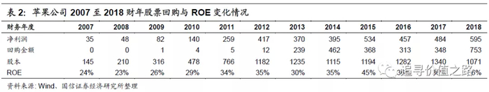 公司进行股票回购后,会出现明显提升的另一个重要指标是公司的ROE。以苹果公司(AAPL.US)为例,其上市公司股票回购在2012年以前基本是没有的,2013年是个转折点,然后回购金额开始大幅飙升。如果单看净利润增速,苹果公司2012财年是417亿美元,2018财年是595亿美元,净利润的年化复合增速只有6.1%。这个增速放到A股市场,完全看不出是一个高科技公司,更像是一个公用事业公司。但通过大量的股票回购,苹果公司的ROE从2013年的30%左右提高到了2018年的56%。到2018财年,苹果公司股票回购的金额高达753亿美元,要大幅超过当年的净利润595亿美元。