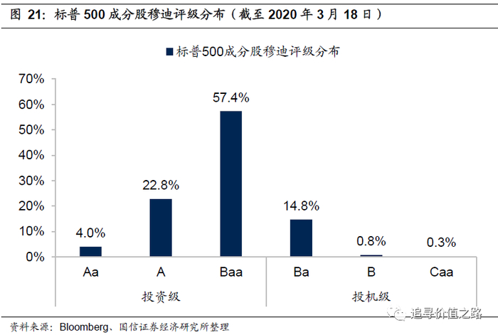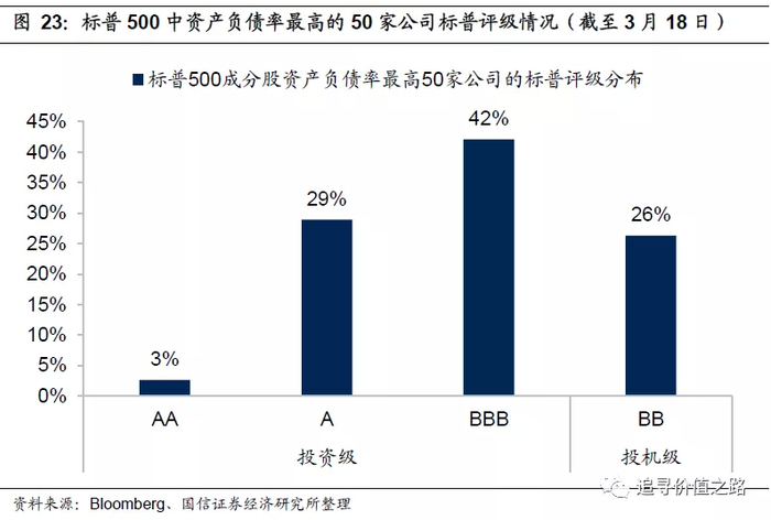 如果将公司样本范围缩小至标普500成分股中资产负债率最高的50家公司,可以看到公司信用评级为投机级的数量占比明显上升。穆迪分类评级下,这50家公司中,投机级企业数量占比为28%,标普评级分类下为26%,均要明显高于全部标普500成分股的15.9%。而同样,在投资级主体公司中,Baa(穆迪投资级最低评级)或者BBB(标普投资级最低评级)占据了绝大的比例。