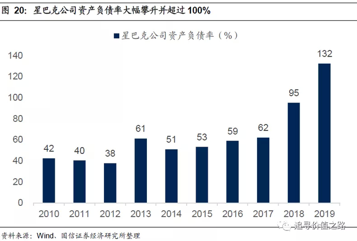 星巴克公司是另一个例子,2017年时资产负债率还只有62%,2019年到了132%。