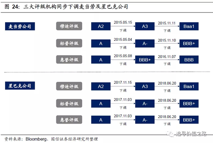 此外,2015年标普公司两次下调麦当劳评级,麦当劳长期发行人信用评级从A级下降至A-再降至BBB+级,同年惠誉评级公司将麦当劳长期发行人违约评级从A级直接下调至BBB+级,并在2016年再次下调至BBB级别。星巴克公司的经历也同样如此。2017年11月,穆迪下调星巴克高级无担保债券评级至A3级,下调原因是因为星巴克计划在2018至2020年通过分红和股份回购的方式向股东返还150亿美元,返还的资金部分将来源于额外的债务。穆迪认为这将导致债务水平显著上升以及信用指标的实质性恶化,因此下调星巴克公司债券评级。2018年6月,穆迪再次下调星巴克高级无担保债券评级至Baa1级,下调原因在于星巴克决定大幅增加债务以将返还股东金额提高至250亿美元。标普与惠誉评级公司在星巴克公司决定发债回购股份后,同样下调企业评级,星巴克评级从A级下降至BBB+级。