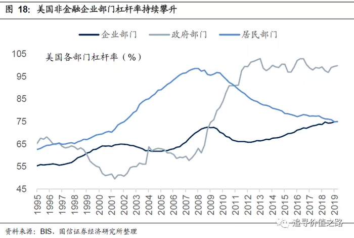 这种情况下,我们会发现,金融危机以后,美国居民部门的杠杆率已经有了十足的下降,政府部门的杠杆率在2012年以后也是基本持平,但企业部门的杠杆率却在不断攀升,甚至已经超过2008年的金融危机水平。
