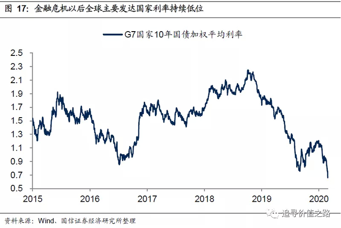 2008年金融危机以后,各国普遍采用了极度宽松的货币政策手段,很多国家的利率水平达到了历史最低甚至是零利率和负利率国家也比比皆是。下图是我们计算的一个G7国家的国债加权平均利率水平, G7国家指的是美国、日本、德国、英国、法国、意大利和加拿大,G7国家利率主要将以上国家10年期国债利率进行一定的加权计算所得,权重为各国经济总量相对占比。可以看到G7国家的整体利率水平已经接近到0附近。