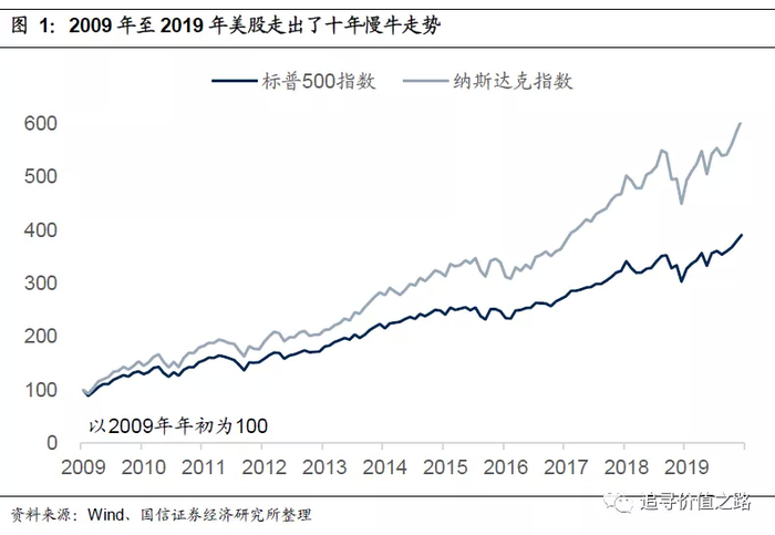 众所周知,在近期的大幅调整之前,最近十年美股表现非常好,走出了十年慢牛的行情。从2009年初到2019年底,美股标普500指数累计涨幅高达290%年化收益率14.6%,纳斯达克指数累计涨幅约508%,年化收益率更是高达19.8%。这还只是非除权指数的涨幅,如果算上股息红利除权,也就是全收益指数,美股在过去十年里的涨幅更是惊人。