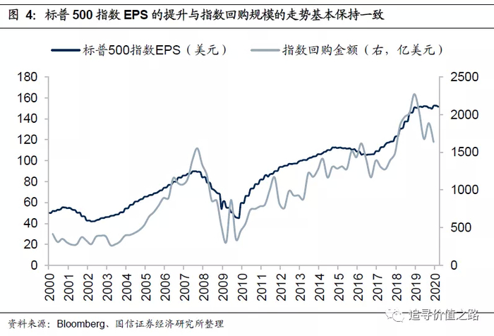 从走势来看,2000年以来标普500指数EPS与回购规模的走势大致经历了三个阶段,2000年至2007年,指数EPS缓慢提升,标普500公司回购的规模也在不断提升并在2007年三季度达到了阶段性峰值。2008年金融危机时期,EPS出现了大幅下降,指数回购金额也出现了断崖式的下跌。随着美国经济逐渐恢复,2010年开始标普500指数EPS和回购金额都出现了大幅的提升。