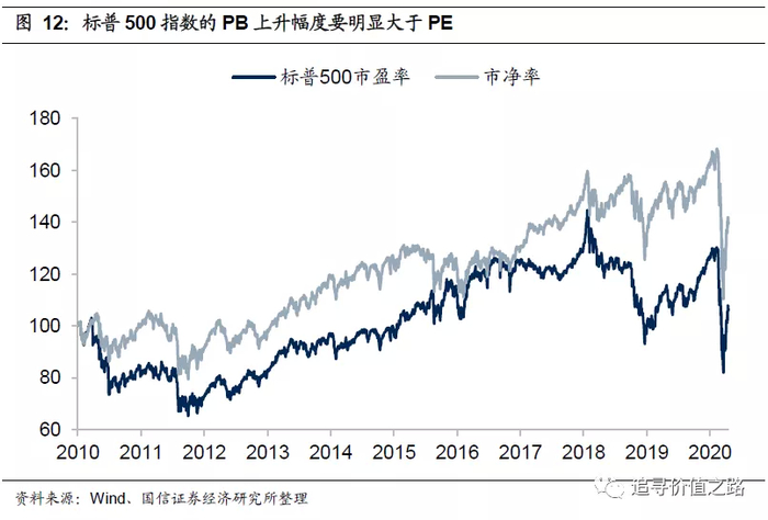 即使从整个市场角度来看,市盈率和市净率也存在这个关系。我们对标普500指数的市盈率与市净率进行了标准化,从走势来看,随着2010年后标普500指数回购金额的大幅提升,标普500指数的PB上升幅度要明显比PE更大,从2010年初到2019年底,标普500指数的PE大概从18倍上升到了24倍,PB从2.0倍上升到了3.5倍。