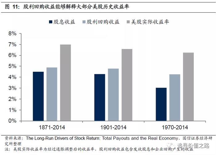 Philip U. Straehl等人对1871-2014年期间美国股市长期收益率进行了深入的研究,研究发现,包含公司派发的股息以及回购股票产生的收益在内,股利回购收益能够解释美国股票历史收益率的绝大部分,特别是在1970年股票回购得到快速发展之后,回购对提升股价收益率的影响更为显著。1871年至2014年期间,美股实际收益率(剔除通胀后)约为7%,其中,股息收益率为4.5%,如果考虑公司回购带来的收益,总的股利回购收益率将上升至4.89%,占美股实际收益率的三分之二以上。上述结论在调整美股的研究区间后仍然成立,1901年至2014年期间,美股实际收益率为6.58%,其中来自于股息收益的部分达到了4.29%,加上企业回购部分,总的股利回购收益率达到4.78%;1970年至2014年期间,美股产生的股息收益为3.03%,将企业回购纳入考虑后这一部分收益上升至4.26%,同期美股实际收益率为6.25%。