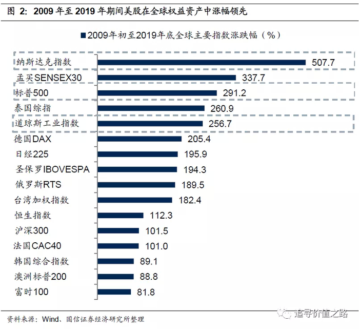 从全球主要股市的表现来看,美股也堪称全球权益市场最强资产。美国三大股指均在全球主要指数累计涨幅前五,纳斯达克指数、标普500指数以及道琼斯工业指数分别位列涨幅第一、第三和第五,均要远远领先于其他很多国家和地区权益指数。即使是美股三大指数中涨幅最小的道琼斯工业指数,其257%的累计涨幅也是富时100指数累计涨幅的三倍不止。