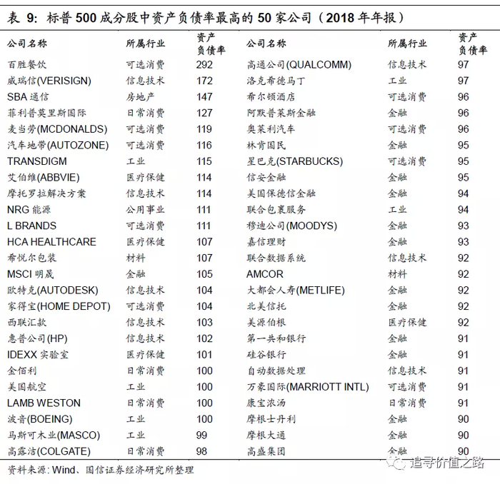 美国上市公司债务杠杆率高得离谱,财务杠杆都用到了极致。仅以下表的标普500成分股为例,资产负债率最高的50家公司,资产负债率都超过了90%。
