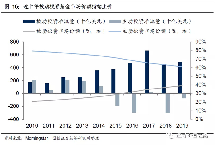 上市公司回购股票带来股价上升,由于被动投资具有低费率、牛市中长期业绩好于主动型基金等优势,投资者纷纷买入被动型基金,增加的资金流入指数成分股,叠加上市公司持续回购股票,进一步推动股指上涨,资金流入被动投资的规模加大。这一正向反馈模式在过去十年的美股市场中不断持续,所以我们看到,2009年后美股市场中ETF的资产规模出现了大幅提升,也能够看到,2009年至2019年期间,资金不断流入被动型投资基金,被动投资基金的市场份额从2010年的21%大幅上升至了2019年的39%。