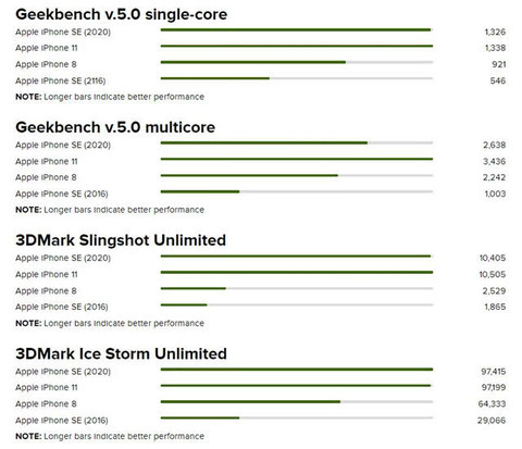 苹果公司的iOS系统对“旧设备”的支持寿命很长,这是购买iPhone的一个重要吸引力。iPhone 8及其A11处理器已有两年半时间,并且可能会在iPhone SE出现之后的两年内停止软件更新。在性能测试中,iPhone SE始终优于iPhone 8和老款iPhone SE。 与iPhone 11、11 Pro和11 Pro Max相比,跑分成绩相似。在实际应用中,玩“Sky光 遇”和“末日穹顶”之类的游戏完全没有问题。编辑照片非常容易,甚至可以使用诸如Wonderscope之类的需要大量图形处理的AR应用程序。