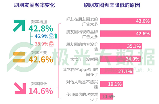 极光大数据的报告还指出,有四成用户刷朋友圈的频率保持不变,但也有14.6%的用户刷朋友圈频率下降,其中的主要原因,正是因为朋友圈广告太多。