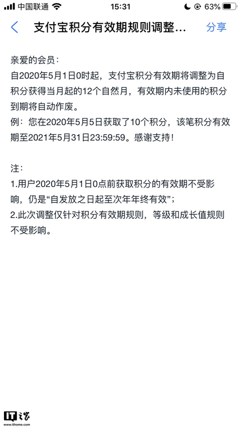 IT之家4月24日消息 近期,支付宝App内会员中心发布新的支付宝积分有效期规则调整,表示从2020年5月1日起,支付宝积分有效期将调整为自积分获得当月起的12个自然月,有效期内未使用的积分到期自动作废。