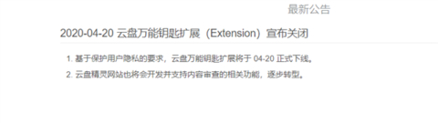 2020-04-20 云盘万能钥匙扩展(Extension)宣布关闭。