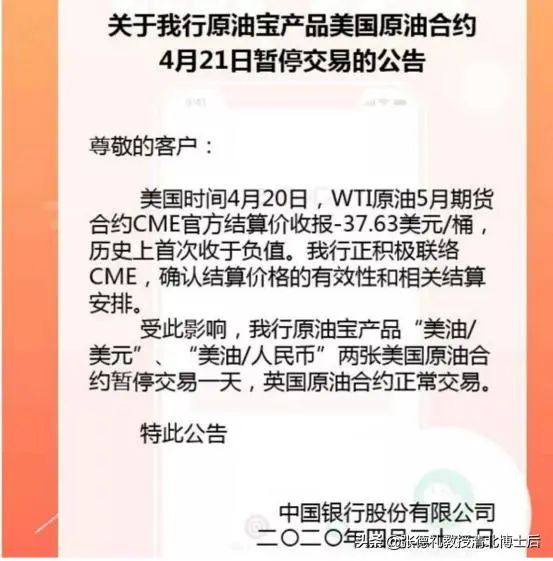 随后,中银的公告间接证实了这一消息——4月22日,中银在官网公告称:“经我行审慎确认,美国时间2020年4月20日WTI原油5月期货合约CME官方结算价-37.63美元/桶为有效价格,根据客户与我行签署的中国银行股份有限公司金融市场个人产品协议我行原油宝产品的美国原油合约,将参考CME官方结算价进行结算或移仓”。