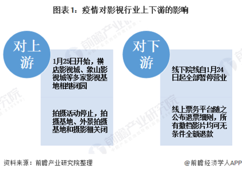 新型冠状病毒肺炎疫情爆发正值春节,疫情对电影产业的影响是巨大的。对影视行业产业链上游的影响包括自2020年1月25日开始,横店影视城、象山影视城等多家影视基地相继闭园,全部剧组的拍摄活动停止,辖区内拍摄场景悉数关闭,包括了拍摄基地、外景拍摄基地和摄影棚等。对电影产业链下游的影响包括1月23日,7部贺岁片集体宣布撤档,择期再映,所有撤档影片均可无条件全额退款;线下院线自1月24日起全部暂停营业。