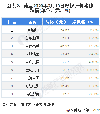 新型冠状病毒肺炎疫情严峻,自春节延长至2月3日后,多个省市发文再延迟复工时间至2月9日。而影视拍摄具有人群较为密集的特点,疫情的严峻性使得影视拍摄受到较大影响,对影院更是沉重的打击,疫情对于影视股股价的影响不言而喻。截至2020年2月13日,多家影视股股价下跌,世纪天鸿跌幅甚至达到10%。