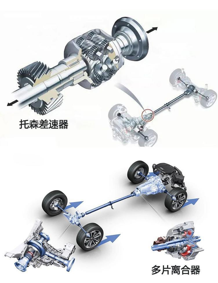 托森差速器是一个扭矩感应式限滑差速器,在quattro系统中,它在一般车型中都是作为中央差速器被安装在变速箱的输出端,然后发动机的动力在通过了托森差速器以后才会分配给后前后桥,最大的亮点在于它可以根据车辆的行驶情况,通过机械结构自身的特性,非常迅速地自动调整前后轴的动力分配,而相比多片离合器,托森差速器有着非常高的可靠性,机械结构的可靠性在大多数情况下都是高于电控的。