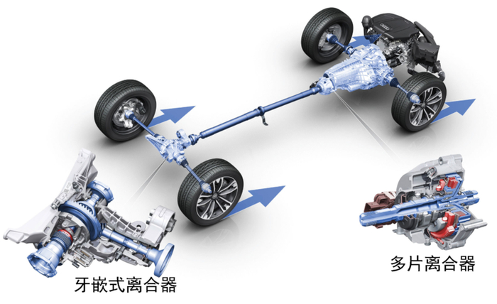ultra一般情况下四驱是不工作的,在有需要四驱介入的时候,中央多片式离合器和后桥上的牙嵌式离合器会结合,再将动力从中间轴传递到后轴。