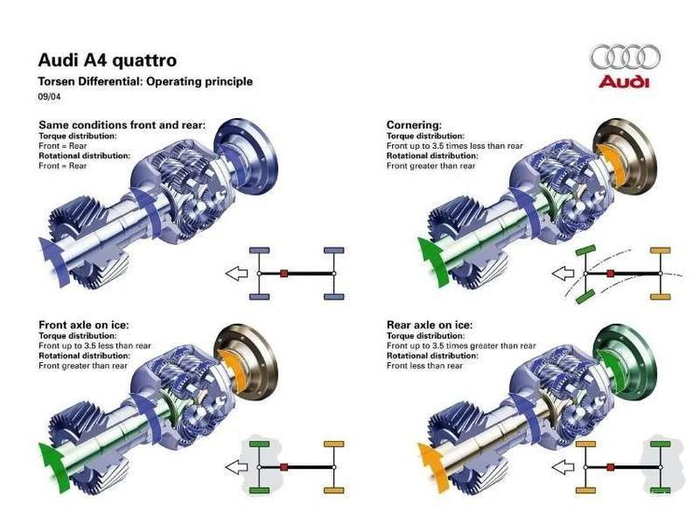 了解quattro的朋友也一定对托森中央差速器一定不会陌生,托森差速器从推出至今也有三十多年,它的机械结构在quattro几次的换代中发生着变化,从1988年开始的第一代托森差速器到托森1型、托森C型,我们所熟悉的带quattro尾标的奥迪车型多数都是装备了托森差速器的,可以说人们对于quattro的了解和认识绝大多数都是与托森差速器联系在一起,既然quattro是奥迪的灵魂,那么可以说托森是quattro的核心,所以难免有人对于A4L的这个也叫quattro的quattro ultra并不认可。