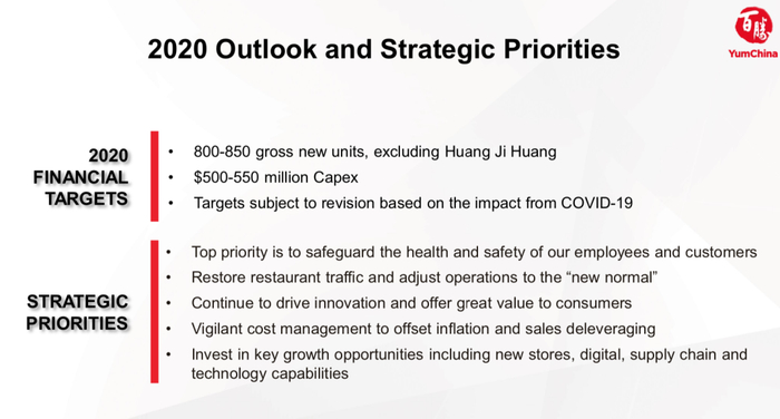 百胜中国今天表示,疫情目前并不会影响其在中国的扩张节奏,将持续投资于新店开张和门店翻新,维持此前制定的全年开店目标,即新增800-850家。