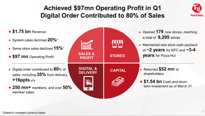 财报显示,一季度,百胜中国总营收下降24%,系统销售同比下降20%,同店销售同比下降15%,取得了9700万美元的经营利润。“第一季度的运营受到疫情的严重影响。”该公司表示。