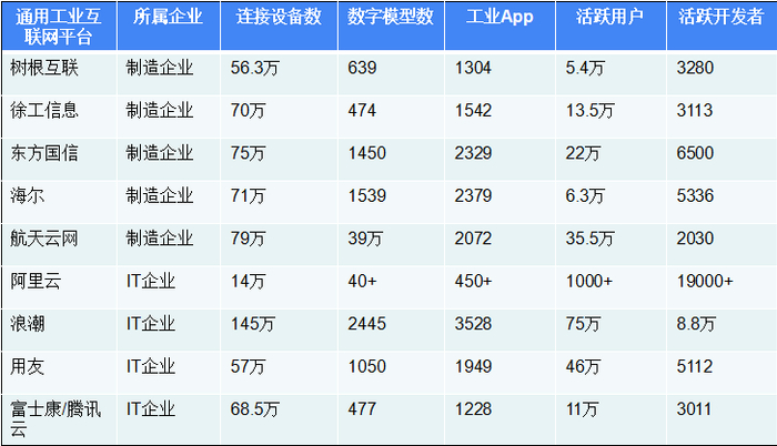 工信部2019年评选出了十大跨行业跨领域工业互联网平台,除了华为FusionPlant工业互联网平台,其他九家平台的发展数据如下,