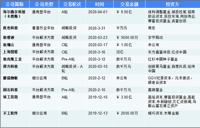 随着服务模式逐渐清晰,以及“新基建”政策推动,工业互联网近期在投融资市场迎来新热度。今年4月初,海尔旗下的卡奥斯工业互联网平台获得9.5亿元A轮融资,创下工业互联网平台A轮融资规模之最。去年12月至今年4月,赛道已发生过多笔融资。