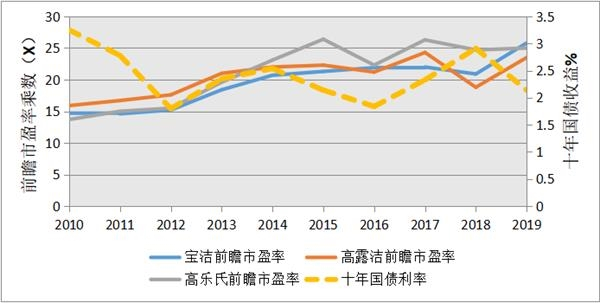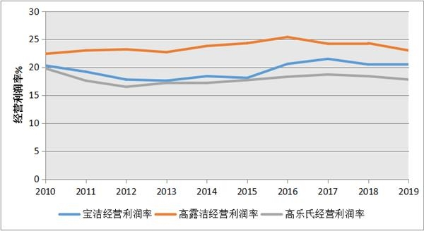 图2:过去十年以来宝洁、高乐氏以及高露洁的经营利润率相对稳定,周期性变化很小(数据来源:各公司年报)