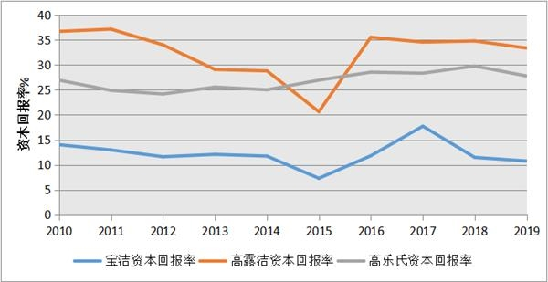 图3:过去十年以来宝洁、高乐氏以及高露洁的资本回报率相对稳定,且都维持在两位数以上的高位(数据来源:各公司年报)