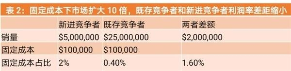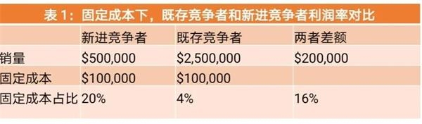 如果既存竞争者拥有80%的市场份额,并简单假设固定成本相同,那么单看固定成本一项,既存竞争者的利润率高出新进竞争者16%。(见表1)
