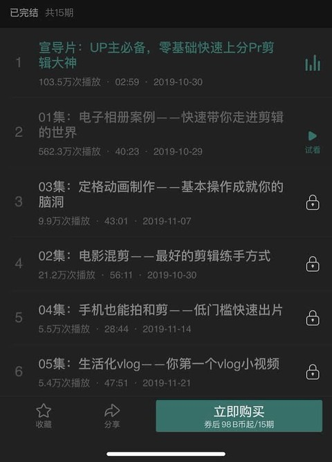 笔者能找到的最高播放量网课是一个Pr剪辑教程,可以看到,在前两集的试看结束后,付费内容就出现了断崖式的下跌,每集也只有十万左右——这也是B站课堂上线后的第一个课程,原价99元打八折,附赠一堆素材包换来的。