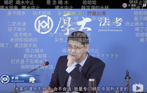 我们以罗翔老师为例,B站敏锐地捕捉到了罗老师身上的几个“梗”:讲课举例常用的张三,被称为“法外狂徒张三”;罗老师讲到上头,迟迟不用身边的水杯喝水,被B站网友戏称“喝水中止”;最后是网课上的蓝色背景“厚大法考”。这些梗也成为了罗翔老师相关的二创视频中的关键要素。