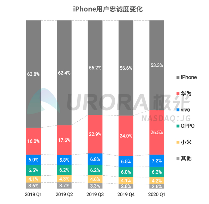市场调研机构极光之前给出的报告显示,2020年Q1,华为手机保有率达30.7%,位居第一;iPhone保有率为19.0%,位居第二;OPPO保有率为17.5%,位居第三,vivo保有率为17.4%,与OPPO仅差0.1个百分点,过去四个季度,vivo和OPPO的保有率差距逐渐缩小。