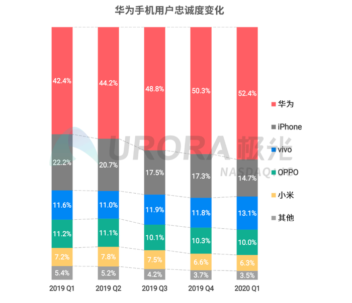 过去4个季度,华为手机用户忠诚度持续提升;2020年Q1,华为手机用户忠诚度为52.4%,较2019年Q1增长10.0%华为换机用户选择iPhone的比例持续减少,由2019年Q1的22.2%降至2020年Q1的14.7%。