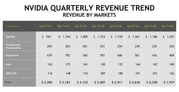 时间来到2020年,美国财经网站MarketWatch曾用“华尔街为之震惊”,来形容英伟达财报的强势表现——游戏板块保持强劲、云计算应用稳中有涨、无人驾驶、专业视觉化、OEM&IP前景可期。