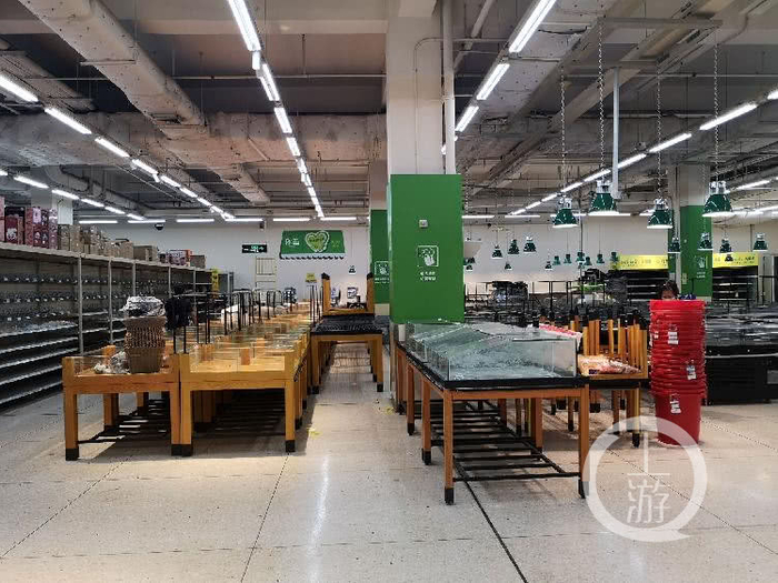 目前,超市内部已关闭了3楼,仅开放2楼部分区域。其中肉类、熟食、散装食品等区域,货架已经全部清空,休闲食品、日化类商品等正常销售,货架呈现出部分清空的状态。另外,超市还开辟了一个专门的区域销售折扣商品,力度较大,吸引了不少前去“捡趴活”市民。