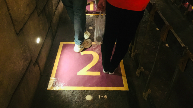 第一财经记者在现场看到,入园必须测量体温,并且出示预约码、随身码等,安检入园后,各个游乐项目、商店和餐厅等排队处都贴满了地贴,人与人之间有一定的安全间距,而工作人员则一直在消毒和清洁,各个餐厅和游乐项目处也都有洗手液等。而餐厅之间留有空位,也是保证安全距离。