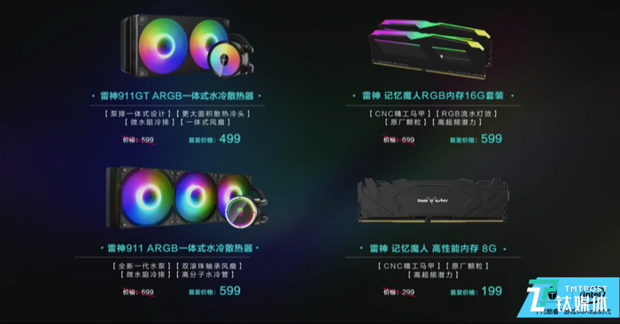 除台式主机外,雷神还带来全新DIY配件,一体式水冷散热器911GT ARGB/911 ARGB和记忆魔人RGB内存两款新品5.11京东首发。同时,雷神高性能一体机首次亮相,Mater A725/A525,也将在618上市。